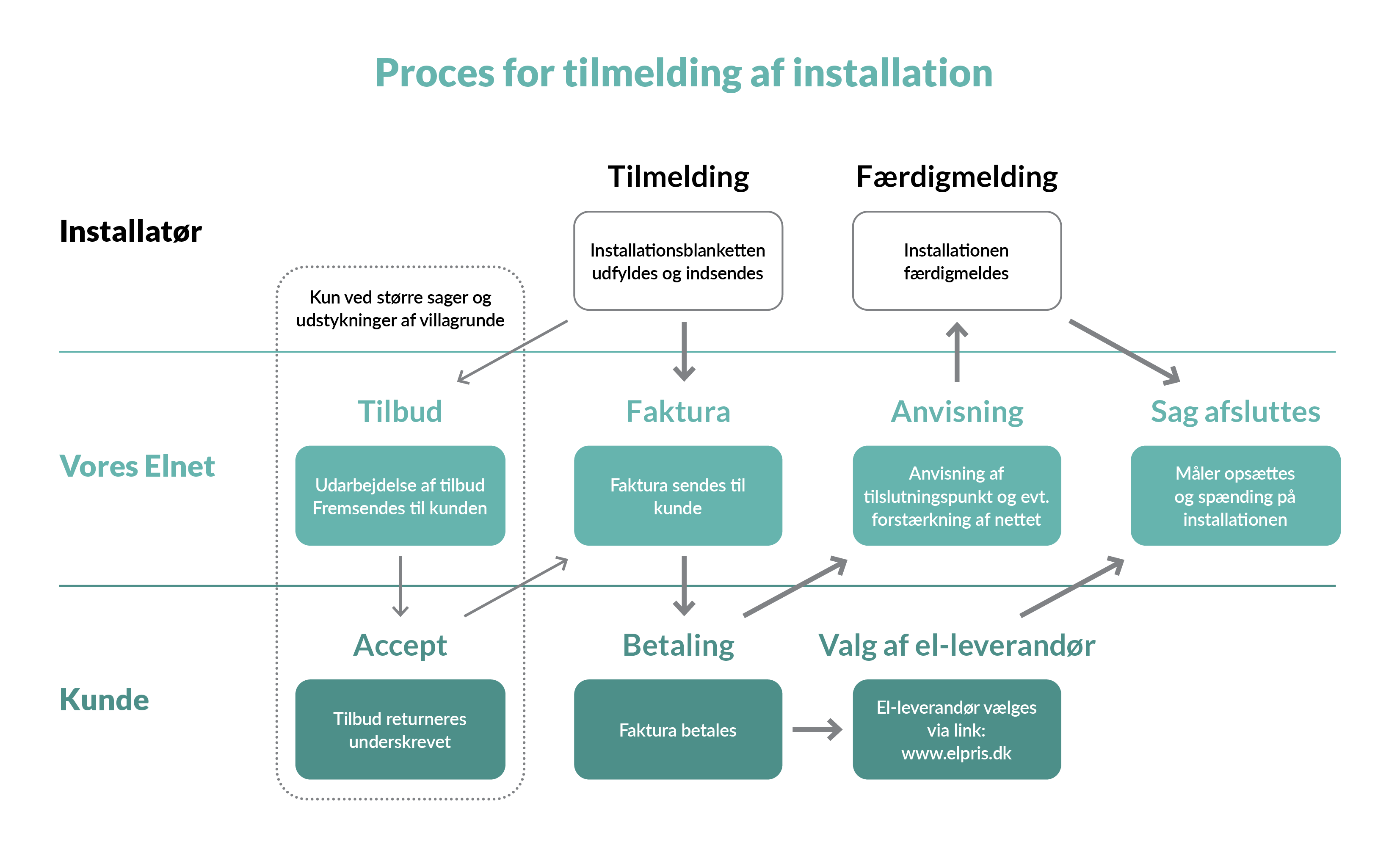 Alle til- og færdigmeldinger på nye installationer, udvidelser af eksisterende installationer, midlertidige installationer mv. skal indsendes til Vores Elnet via eltilmelding.